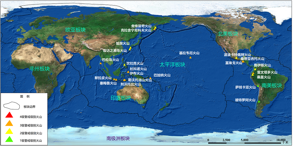本周0座火山处于四级警戒,13座火山处于三级警戒,7座火山处于二级警戒,2座火山处于一级警戒。