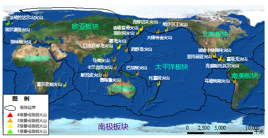 本周0座火山处于四级警戒,13座火山处于三级警戒,9座火山处于二级警戒,1座火山处于一级警戒。