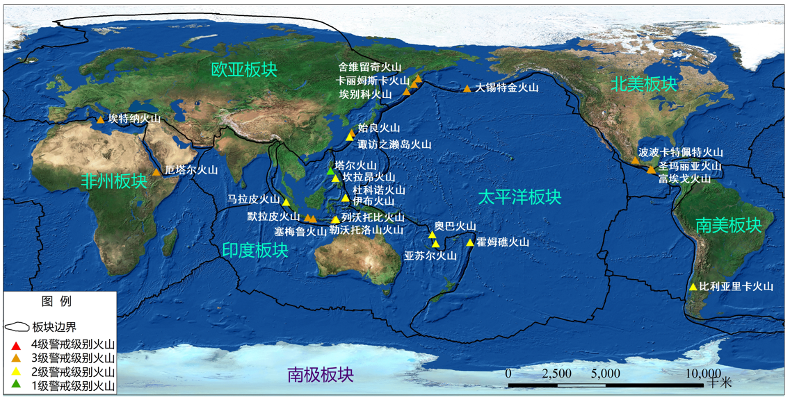 本周0座火山处于四级警戒,14座火山处于三级警戒,9座火山处于二级警戒,1座火山处于一级警戒。