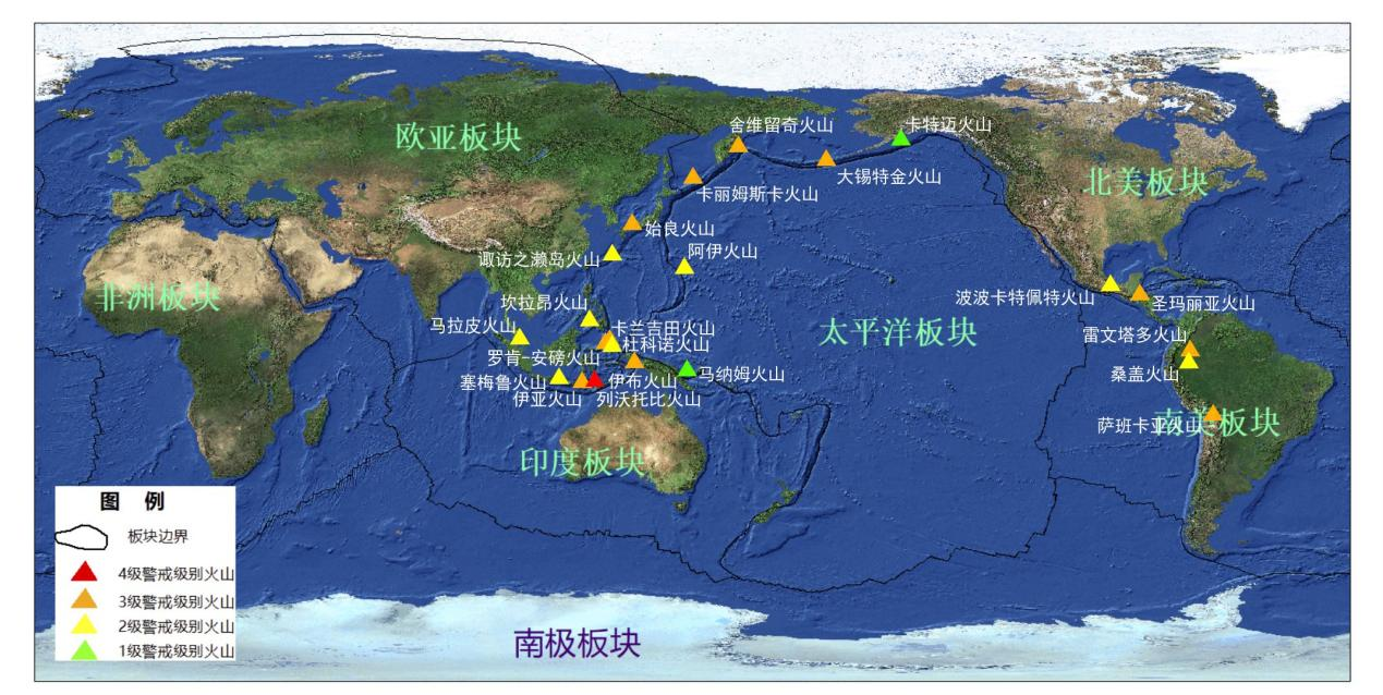 本周1座火山处于四级警戒,11座火山处于三级警戒,8座火山处于二级警戒,2座火山处于一级警戒,详见表1。