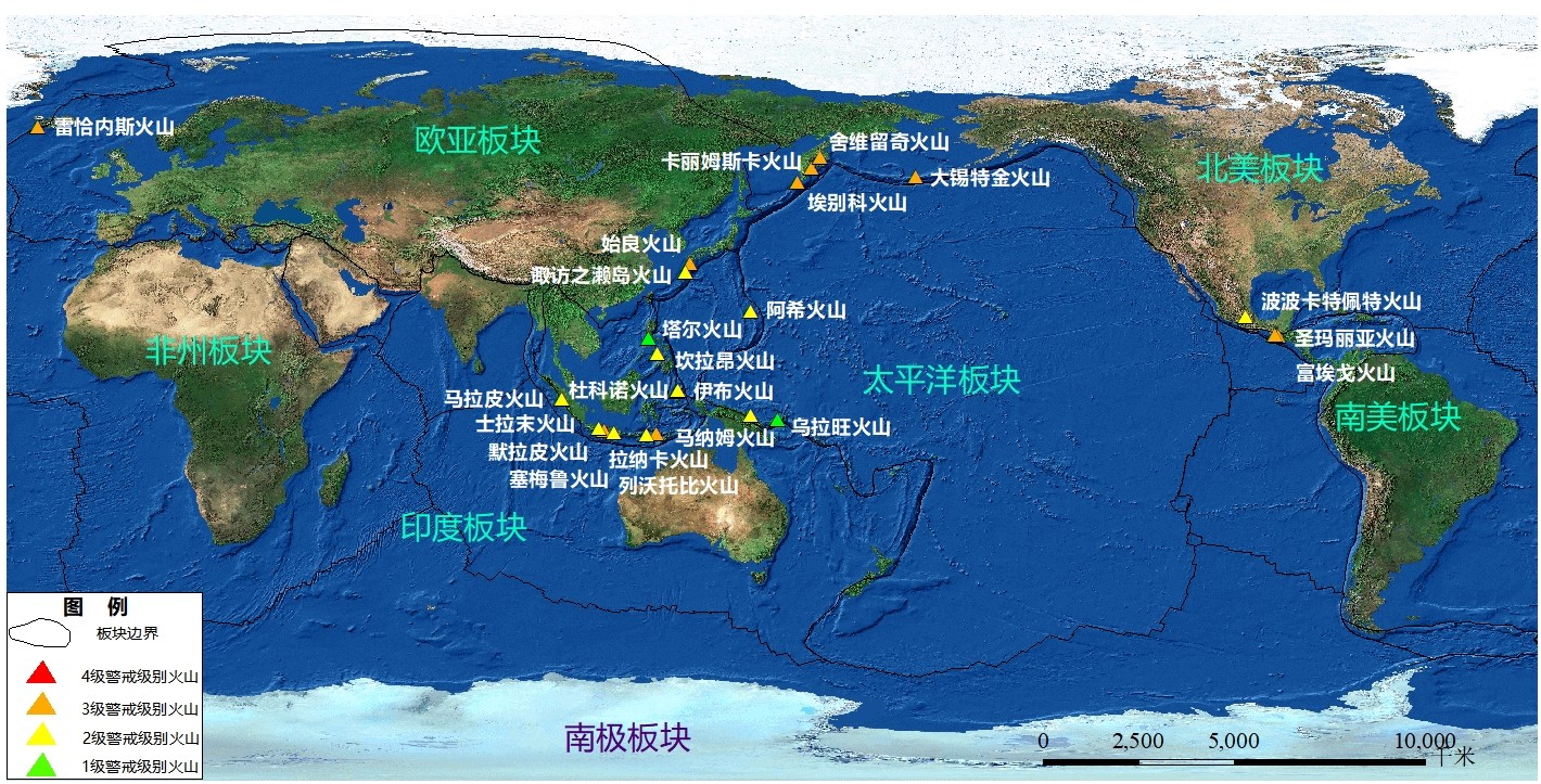 本周0座火山处于四级警戒,11座火山处于三级警戒,10座火山处于二级警戒,2座火山处于一级警戒。