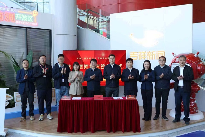 吉林广播电视台副台长梅雪与吉林省地震局党组成员、副局长王军亮共同签署合作协议,吉林省委宣传部副部长、吉林广播电视台党组书记、台长王卫东,吉林省地震局党组书记、局长赵广平出席并见证了此次签约仪式。
